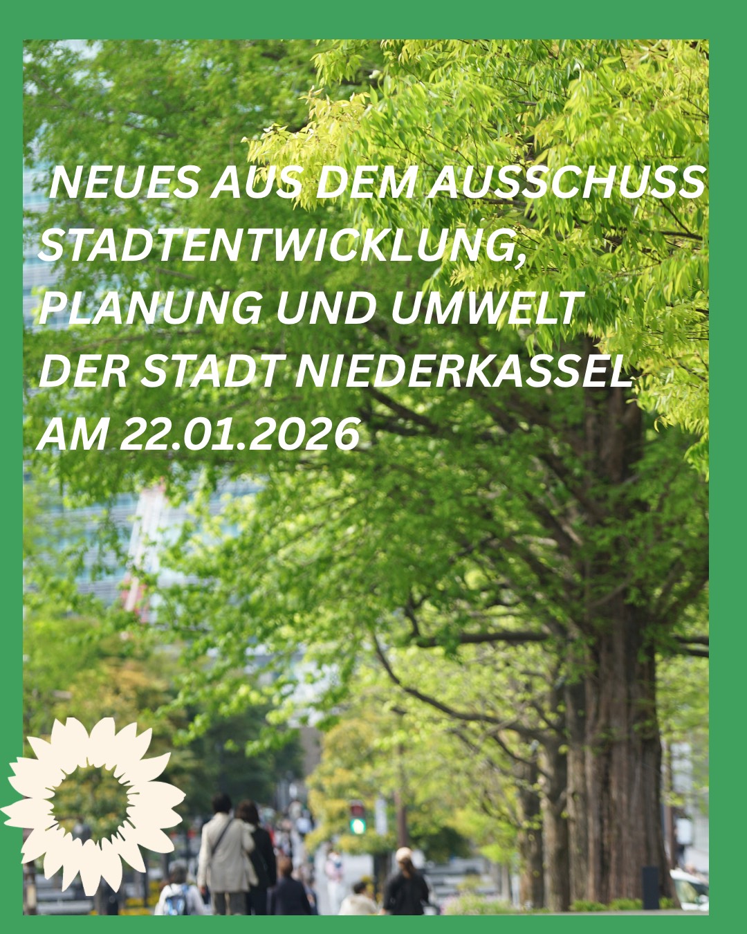 Die GRÜNEN hatten beantragt, an der Initiative „NRW pflanzt“ teilzunehmen. Diese unterstützt Kommunen beim Pflanzen von Bäumen – einschließlich Organisation, Fundraising und Pflege über drei Jahre, finanziert durch Spenden.